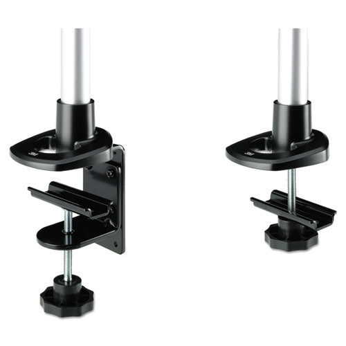 Monitor arm provides 7.5" of height adjustability on pole and extends 19.5" from the base. Monitor can rotate from landscape to portrait, tilt forward and back and move front to back for optimal viewing. Clamp and grommet mount hardware fits desks up