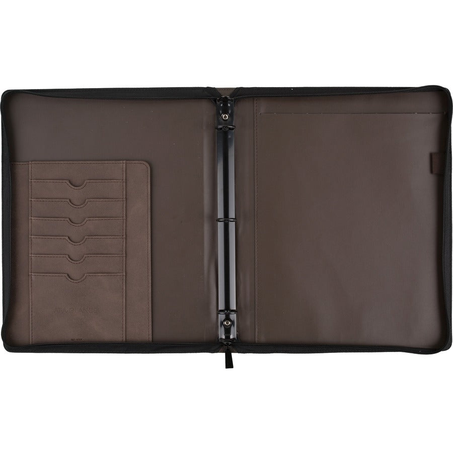 Harrison Day Planner offers casual styling with a professional look. Plan with confidence knowing your valuable information is safe with a secure zip closure. Inside, the planner contains undated internal pocket, business card holder, and three-ring binder with 3/4" rings. The binder includes 12 weeks of undated planning pages, undated tabbed monthly planning pages, event and holiday calendar, eight-year overview, double-letter tabbed address pages, business card holder, notepad, zipper pouch, and page marker ruler.
