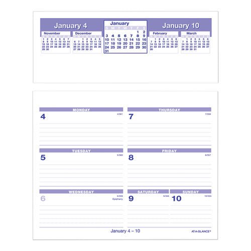 Weekly pages flip up and drop into a convenient storage base. One week per page, ruled for open scheduling. Current, two past and two future months reference; federal holidays highlighted. Printed in blue and red inks. One-ring calendar base is made- Weekly pages flip up and drop into convenient storage base.
