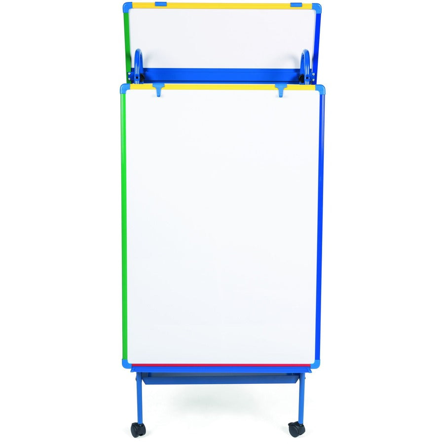 This fully mobile and adjustable, double-sided easel is versatile enough for any situation. Magnetic lacquered steel surface means that it is suitable for frequent use and great for use as bulletin board with magnets (sold separately). Both boards adjust in height from 55" to 66" from floor. Adjustable height means it is suitable for any age group. Each board measures 29-1/2" wide x 41-7/10" high. Both boards are equipped with an accessory tray and aluminum frame. Bottom shelf (23-1/3" wide x 1" thick x 17-4/5" high) offers a handy storage area. Fully adjustable pad clamps hold any size easel pad. Easel features 2" easy glide casters for enhanced mobility. The caster locks for stability when not in use.