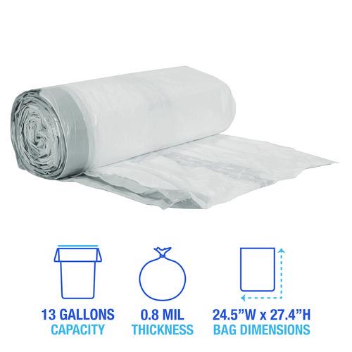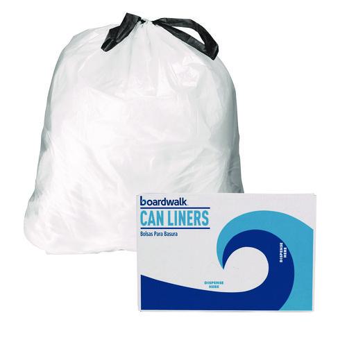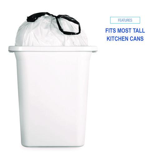 Boardwalk® drawstring kitchen bags are easily opened and closed with highly visible, black draw tape closure. Durable bag and closure keep contents secure and contained. White, 13-gallon, plastic trash bags fit in most tall kitchen waste receptacles
