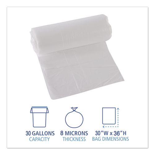 Image of Boardwalk® High-Density Can Liners, 30 gal, 8 mic, 30" x 36", Natural, Perforated Roll, 25 Bags/Roll, 20 Rolls/Carton