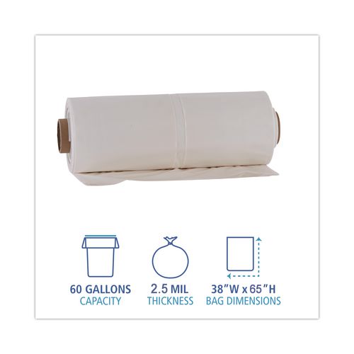 Boardwalk® Industrial Drum Liners Rolls, 60 gal, 2.5 mil, 38" x 65", Clear, 50/Carton