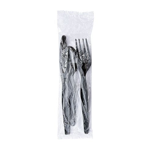 Serve virtually any meal with this cutlery kit. Each pre-packaged, cutlery wrapped kit contains a medium weight plastic fork, spoon, and knife. The convenient kits make set-up for an event or packing a to-go meal quick and easy. Individually packaged