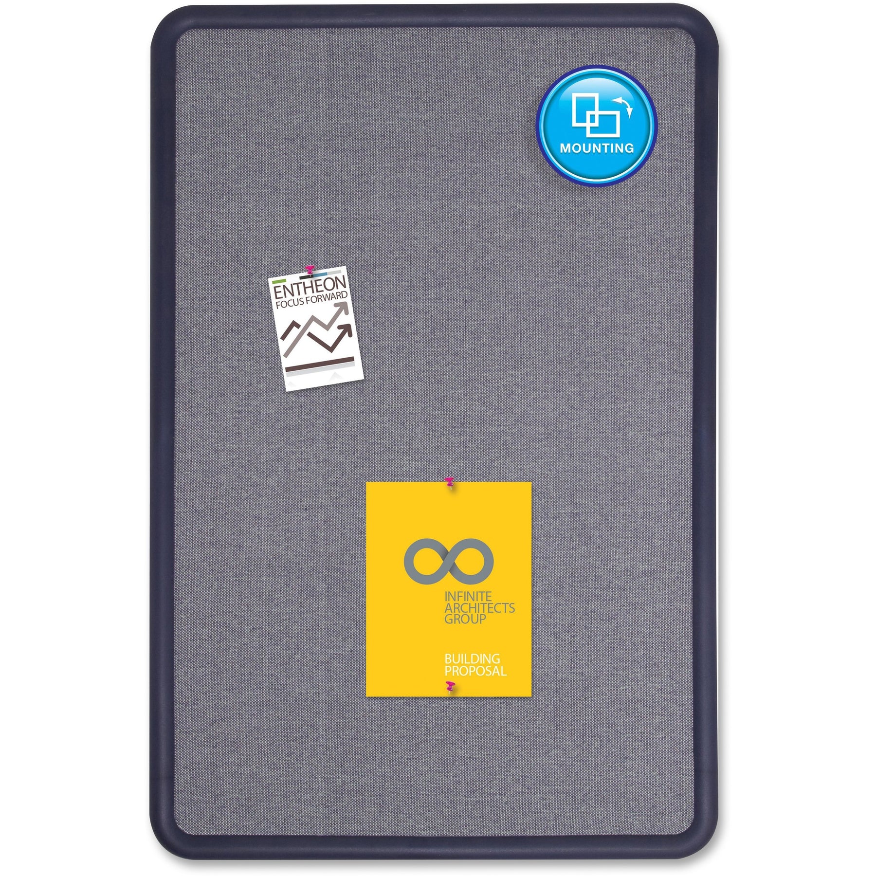 - Durable fabric bulletin board surface backed by high-density fiberboard holds documents securely in place.