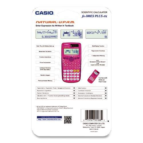 SKU: CSO300ESPLS2PK Manufacturer: CASIO, INC. Mfr. Part Number: FX-300ESPLS2-PK Brand Name: Casio® Alternate Part Numbers: CSO300ESPLS2PK, CSO-300ESPLS2PK, FX-300ESPLS2-PK, 00889232609676 (GTIN) Country of Origin: TH (THAILAND) TAA Compliant: No UNSPSC Code: 0044101801 Unit of Measure: EA (1 Each) UPS Shippable: Yes Air Shippable: Yes Item Dimensions: 8.87 in. x 5.05 in. x 0.82 in. Weight: 0.4000 lb. Expiration Date: No Warranty Information: Manufacturer's limited one-year warranty. Environmental Properties