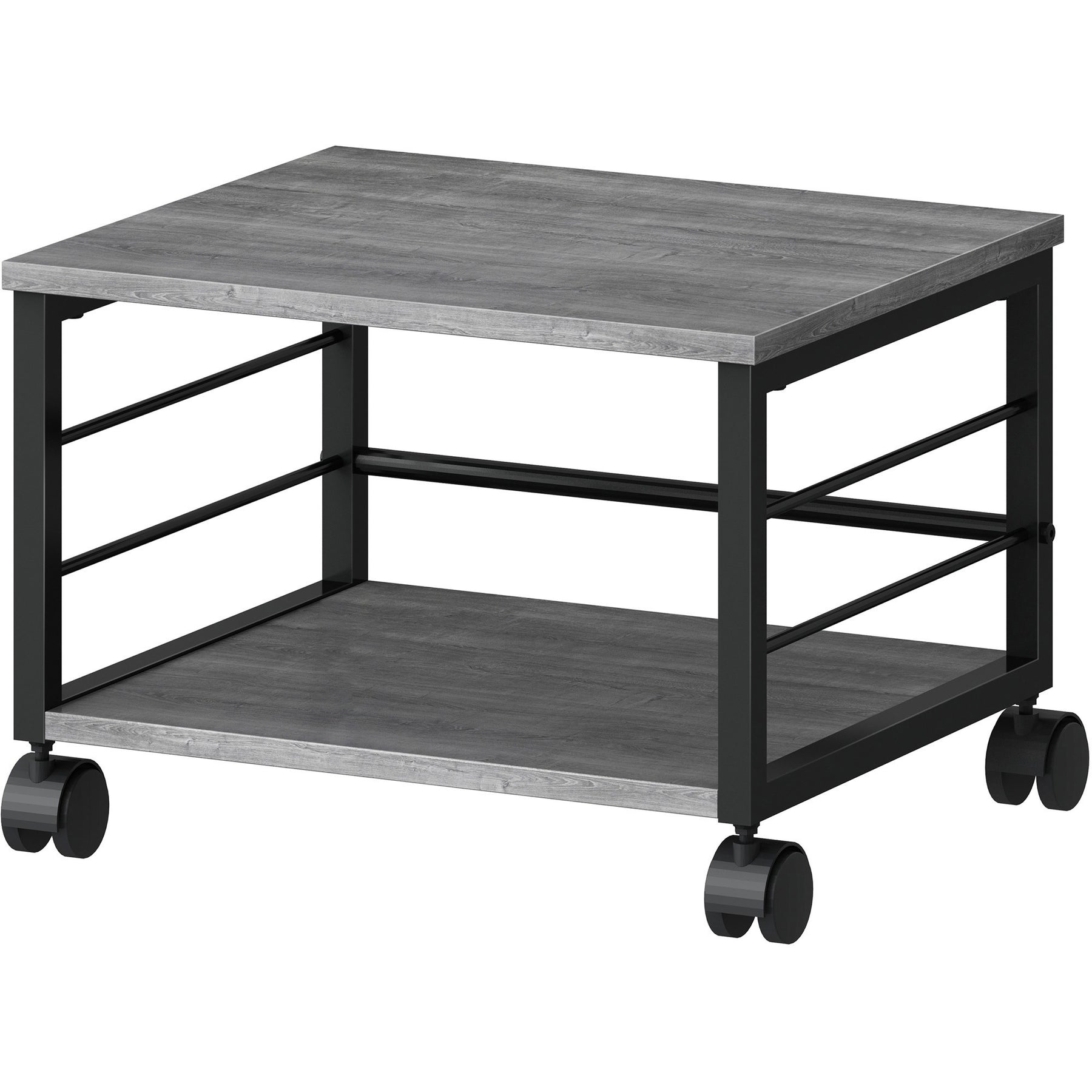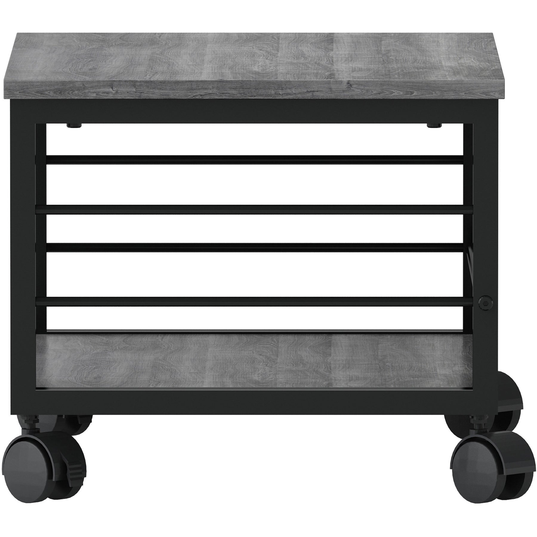 Underdesk Mobile Machine Stand easily rolls under your desk or beside it to hold your essential devices. Metal frame with black powder coating offers sturdy support. Top shelf holds up to 100 lb., and the bottom shelf holds up to 50 lb. The 3/5" thic