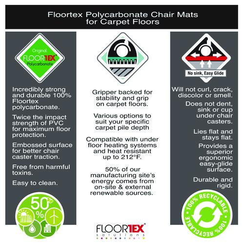 Cleartex Ultimat polycarbonate chair mats are the ultimate in quality and durability in floor protection and ergonomics. These high clarity chairmats for carpeted flooring are made from Floortex Original polycarbonate, which has double the impact str