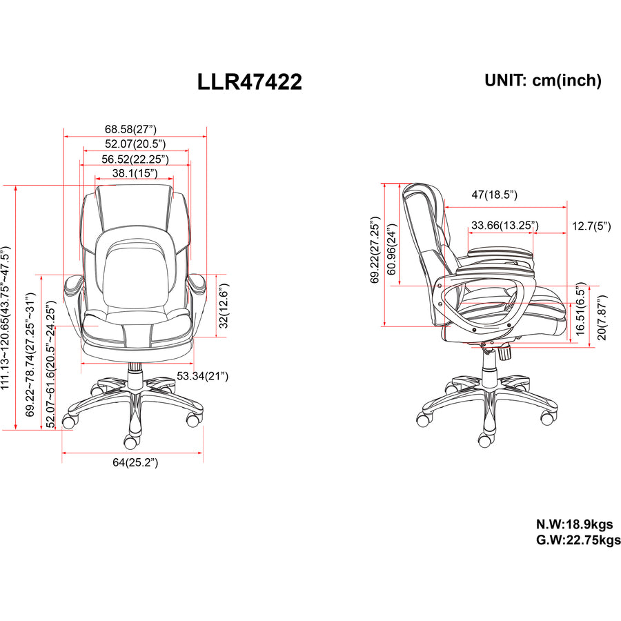 Part of Lorell's Wellness by Design collection, this Accucel Executive Chair is office seating approved by the American Chiropractic Association. Lumbar Accu-pressure promotes increased circulation. Accucel technology provides targeted comfort and support. Dense, EVA convoluted foam in the lower back area features a durable open-mesh covering. Luxurious, black bonded leather upholstery provides a sleek look. Functions include pneumatic seat-height adjustment from 20-1/2" to 24-1/4", tilt (from 102 to 119 degrees) and tilt lock. Arm-integrated fingertip controls allow easier seat height and tilt lock adjustment. 26" five-star nylon base is equipped with 1-24/25" diameter dual-wheel casters for easy chair movement. Seat measures 21" wide x 18-1/2" deep x 6-1/2" thick. Back size is 24-1/4" wide x 27-1/4" high x 6-1/4" thick. Executive chair meets or exceeds BIFMA standards. Weight capacity is 275 lb.