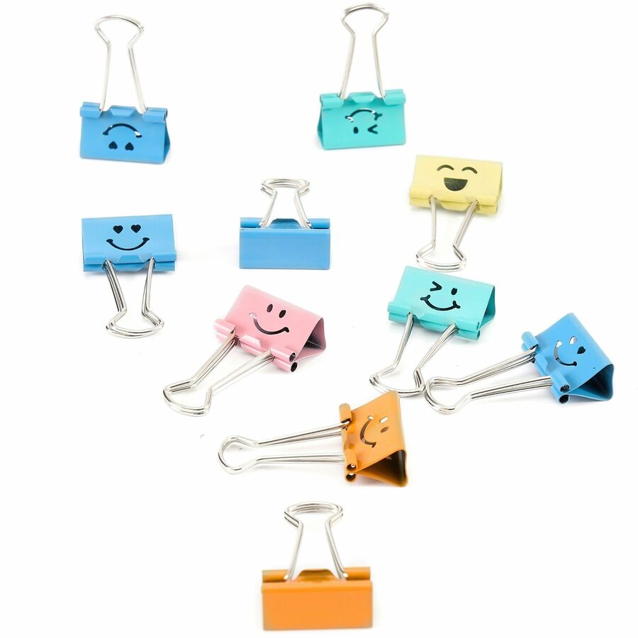 Binder clips feature an assortment of smiling faces to add a playful touch when organizing your papers. Sturdy design opens easily and clamps down tightly to prevent papers from sliding out. Multiple bright colors allow you to color-code your papers for easy organization. Binder clips are perfect for offices, classrooms and more.
