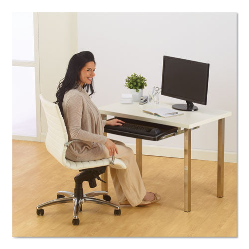 Keyboard drawer uses SmartFit® System Measure, Adjust, Fit. Workspace that works for you. Sliding drawer has ample room for keyboard with wrist rest and a mouse with mouse pad, and can be installed at one of three height levels. Under-desk design ma