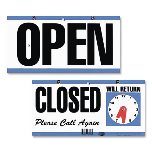 Reversible sign is easy to switch to let people when you are open for business. Closed side features an adjustable clock so you can indicate lunch/break closure times. Weather-resistant plastic with chain for hanging. Size: 11.6 x 6; Message(s): Open