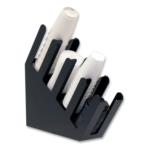 Keep coffee cups and lids at your fingertips. This graduated coffee cup and lid dispenser has 4 compartments and a 20-cup capacity per compartment. So, whether you're stocking up or taking out a cupit's easy to do thanks to the angled organizer desig