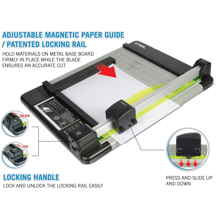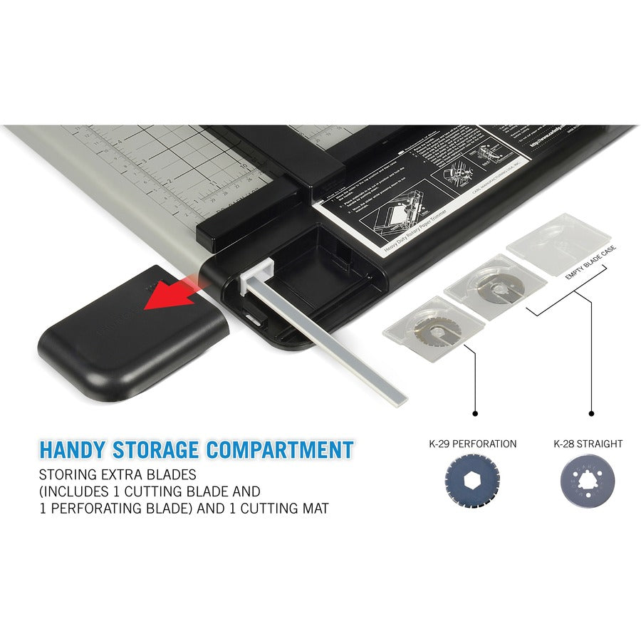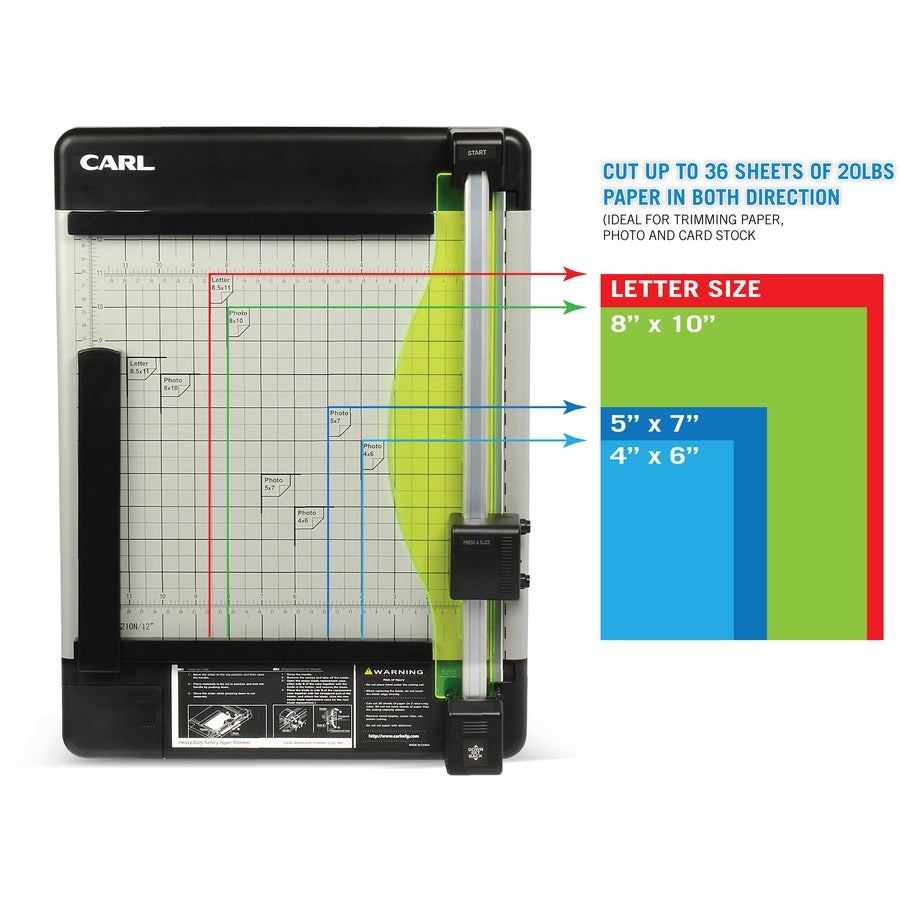 Heavy-duty rotary trimmer is designed for the most demanding trimming projects and made with a high percentage of recycled ABS plastic. Patented, locking rail mechanism and luminous paper holder are made of light harvesting acrylic. Use rotary trimmer to trim up to 36 sheets of standard copy paper. Trimmer also cuts cardstock, artist black-core matboard, 1/8" foam board and plastic sheets. Handy storage compartment holds extra blades and cutting mats. 12" trimmer also includes handy built-in paper guide, carrying handle, spare cutting mat, and straight and perforating blades.