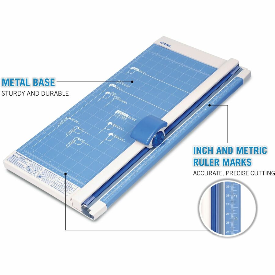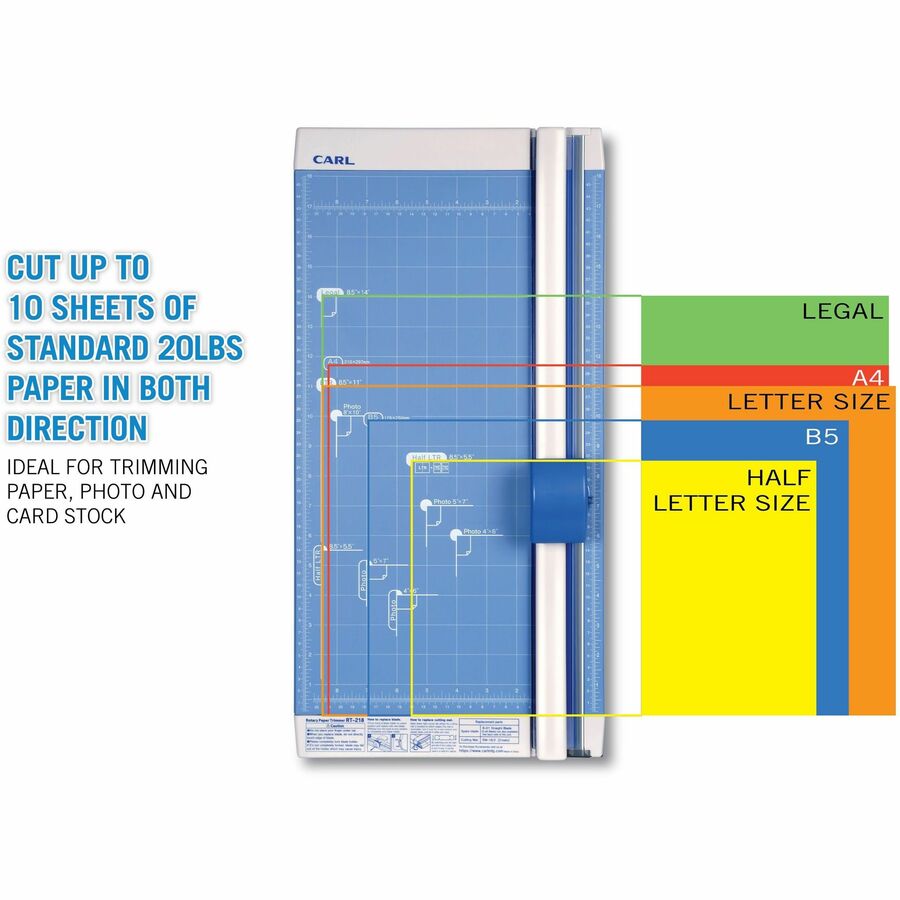 Professional rotary trimmer with 18" blade is ideal for a variety of office functions as well as school, arts and crafts projects. Patented Carl rails and premium carbide blades hold paper and paperboards firmly in place and cut more precisely. Trimmer has a sturdy, metal calibrated base for accuracy and added stability and features preset measurements for common-sized items. Use trimmer to cut mat board, cardstock, plastic sheets, and more. Blade cuts up to 10 sheets of standard copy paper. Use optional B-Series blades (not included) for 11 different cutting patterns.