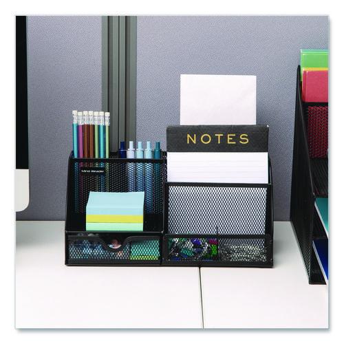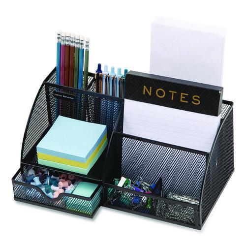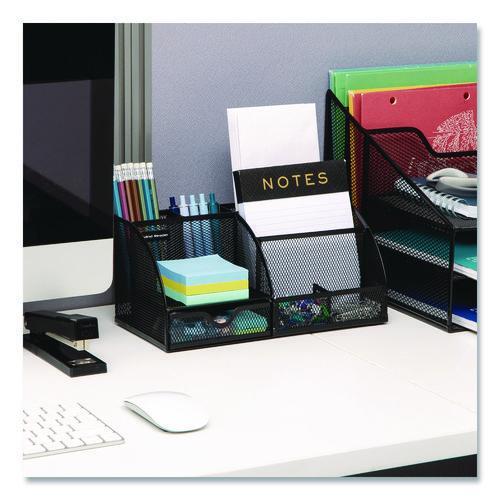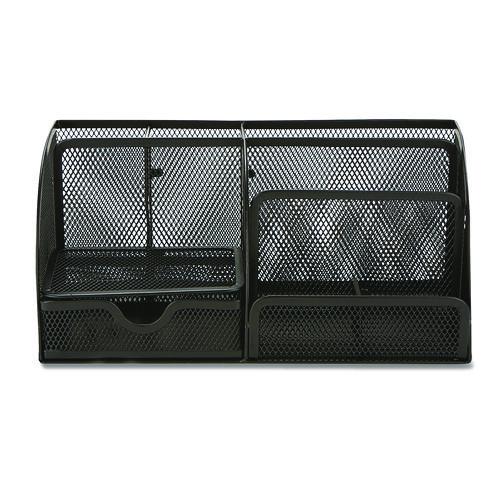 • The black mesh material of this seven-compartment desktop organizer is stylish and fits with any desktop decor.