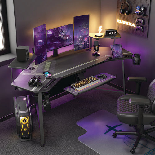 Wing-shaped gaming desk creates a large desk space all within reach. Built-in and included accessories complete your computer setup all in one package. Worksurface/Base Color: Black; Color Family: Black; Worksurface Shape: Wing-Shaped; Worksurface Ma- Features large desktop, perfect for gaming, streaming, home office, or creative setups.
