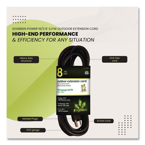 When the going gets tough, the tough get going, and GoGreen Power lives up to that! The robust and durable, contractor grade 16/3 SJTW extension cord is ready to rumble, both indoors as well as outdoors. Moisture-resistant, abrasion-resistant and dur- Depend on this contractor grade 16/3 SJTW extension cord. (This item should not be used with an EV Charger.)