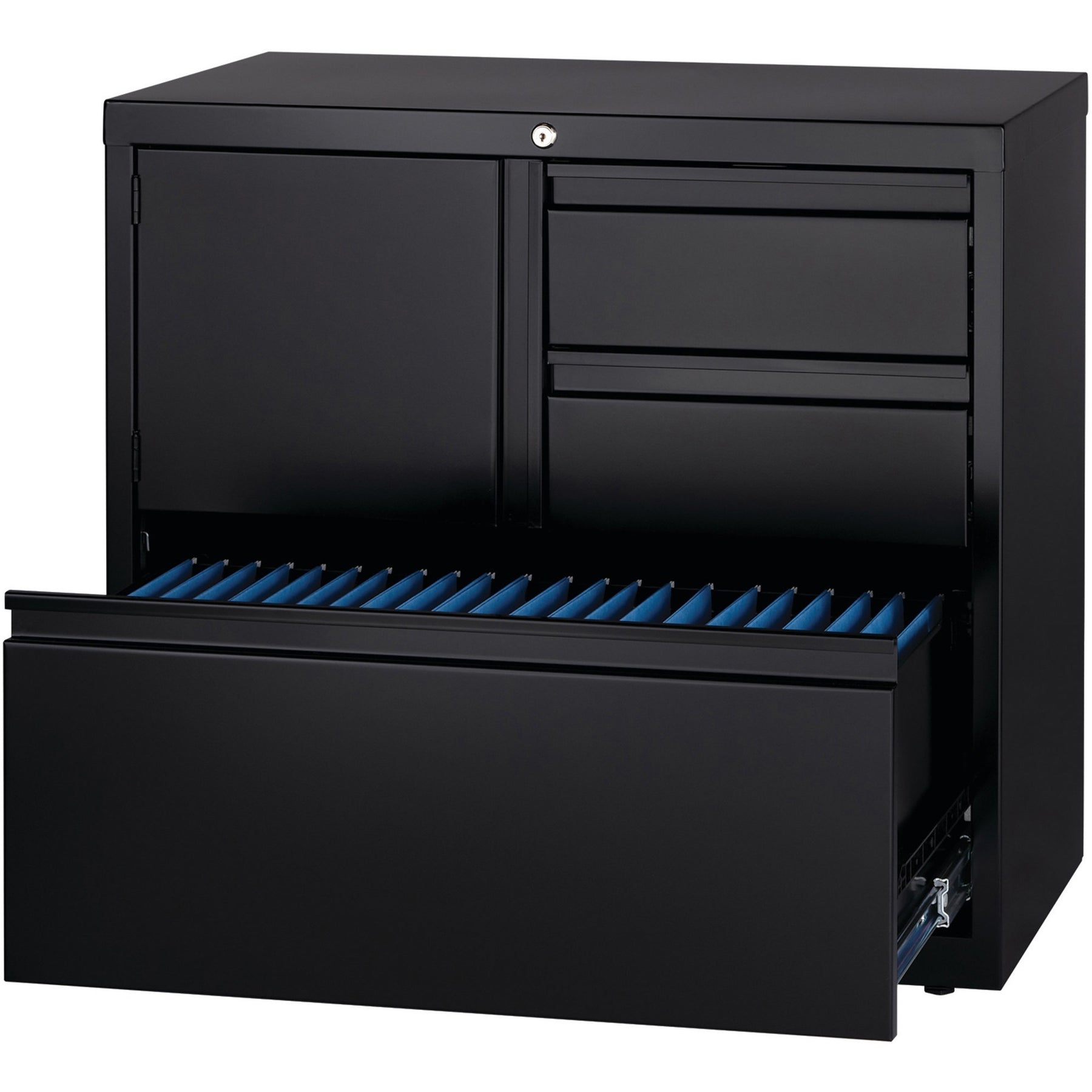 Lateral file offers versatile storage options with a personal storage compartment, two box drawers and a file drawer. File drawer includes hanging file rails for side-to-side filing in letter-size, legal-size or A4-size. Storage compartment includes