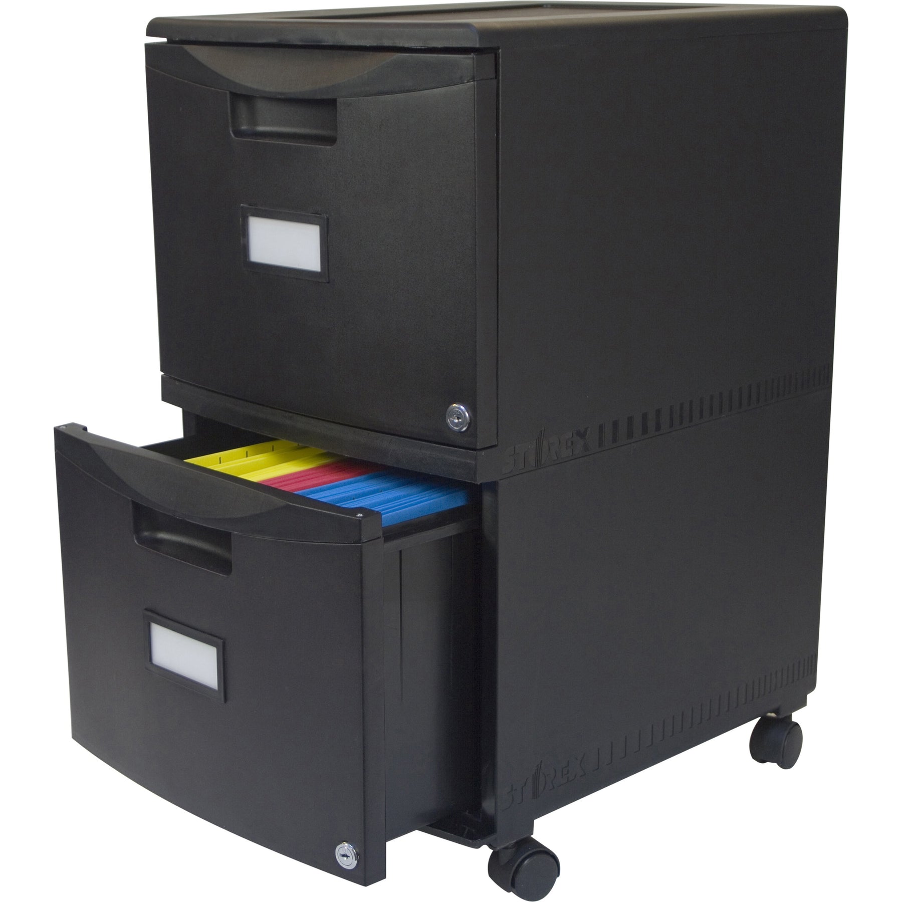 Mobile cabinet with two drawers makes filing easy and efficient. Made of heavy-duty plastic, cabinet features built-in rails for letter-size or legal-size hanging files. Each drawer locks individually and includes a built-in label holder. Cabinet rolls on four 1-1/2" casters (two are locking). Cabinet is made with a high percentage of post-consumer recycled material.