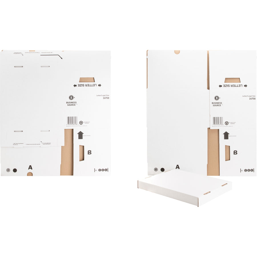 Heavy-duty storage boxes feature a liftoff lid for easy access to letter-size or legal-size files. Use hand holes to move and carry. Boxes are made of sturdy corrugated cardboard and have a 650 lb. stacking strength. Each box contains a high percentage of recycled material.