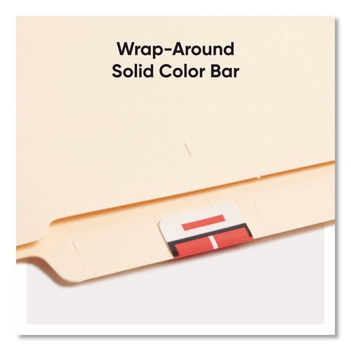 Keep files organized at a glance with these alphabetic labels that feature a wraparound solid color bar and a colored character printed on a white background. Colors are compatible with end tab systems using the bar-style format. Convenient dispensin