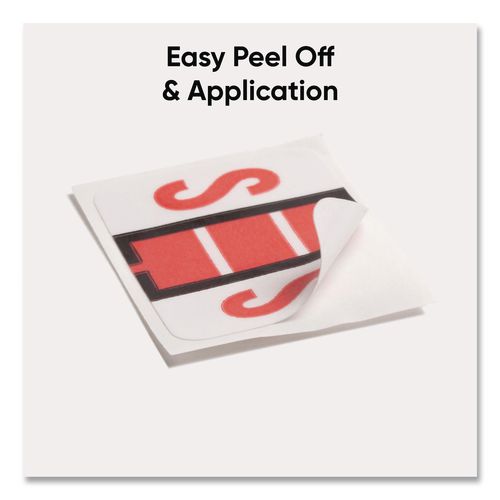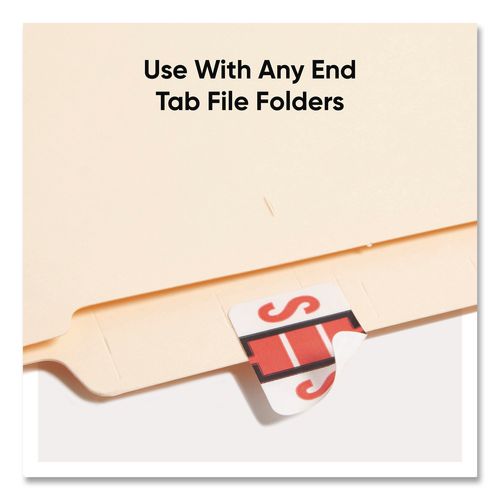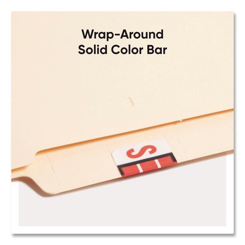 Keep files organized at a glance with these alphabetic labels that feature a wraparound solid color bar and a colored character printed on a white background. Colors are compatible with end tab systems using the bar-style format. Convenient dispensin