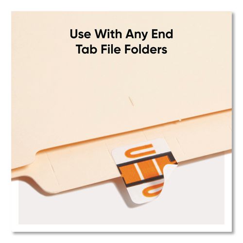 Keep files organized at a glance with these alphabetic labels that feature a wraparound solid color bar and a colored character printed on a white background. Colors are compatible with end tab systems using the bar-style format. Convenient dispensin