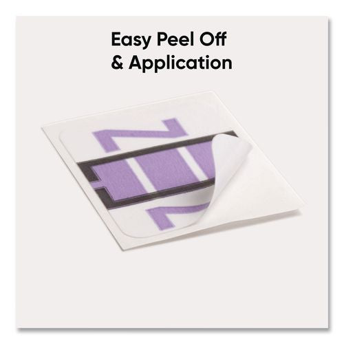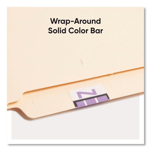 Keep files organized at a glance with these alphabetic labels that feature a wraparound solid color bar and a colored character printed on a white background. Colors are compatible with end tab systems using the bar-style format. Convenient dispensin