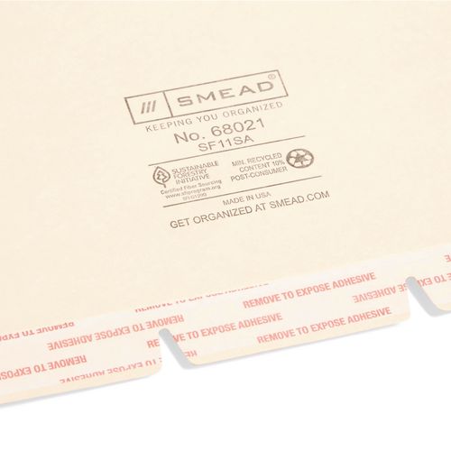 SKU: SMD68021 Manufacturer: SMEAD MANUFACTURING CO. Mfr. Part Number: 68021 Brand Name: Smead Alternate Part Numbers: SMD68021, SMD-68021, 68021, 50086486680214 (GTIN), 00086486680219 (GTIN) Country of Origin: US (United States) TAA Compliant: Yes UNSPSC Code: 0044122011 Unit of Measure: BX (Box of 100) UPS Shippable: Yes Air Shippable: Yes Item Dimensions: 11.20 in. x 9.30 in. x 1.50 in. Shipped Dimensions: 11.20 in. x 9.30 in. x 1.50 in. Weight: 3.6400 lb. Expiration Date: No Environmental Properties