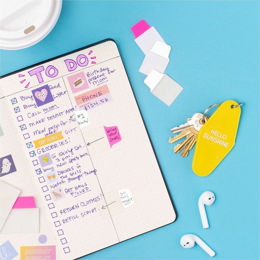 • Writable on both sides with a clear adhesive body so you can see text underneath.