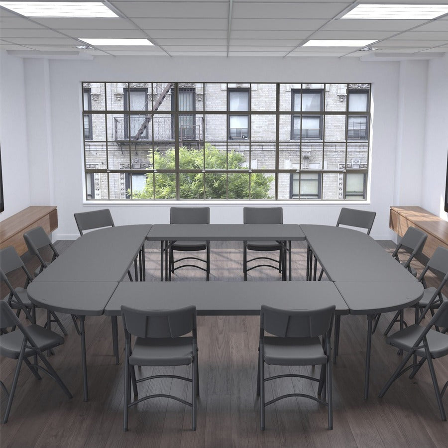 ZOWN Classic Corner Commercial Blow Mold Folding Table features a small, compact size to perfectly seat one person in an office setting or be combined with another family of tables. Its durable construction is molded from HDPE, a premium resin material capable of withstanding all weather elements for reliable indoor and outdoor use. Angular design provides maximum efficiency and adaptability when being moved into different designs. For example, it can be combined with additional tables to create half-moon shape or a full circle. Telescopic legs slide in for optimal folding. Despite its capability to hold up to 200 lb., the corner table is incredibly lightweight and easy to transport.