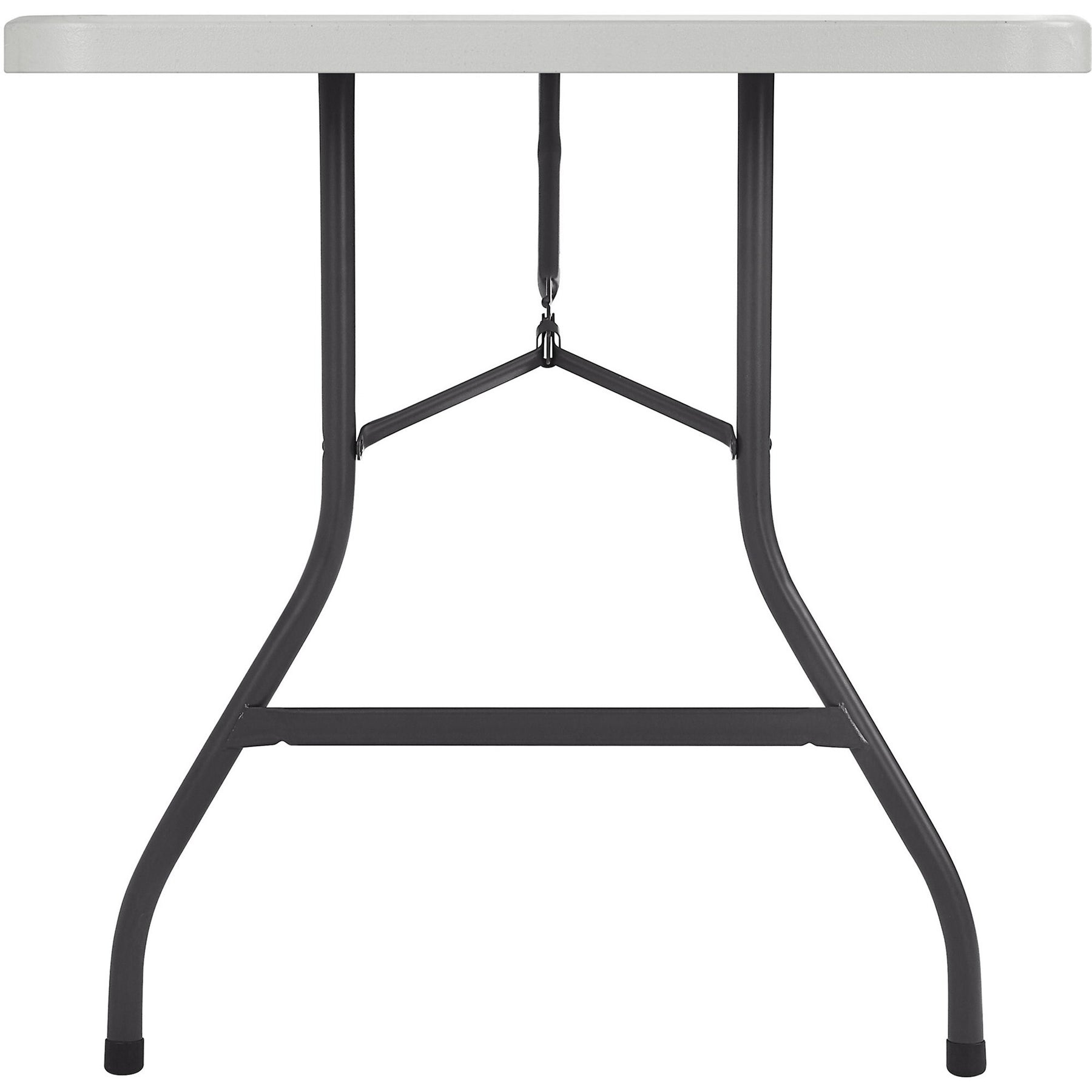 Rectangular banquet table is designed for light-duty use indoors or outdoors. The thick, square-edge top is made of blow-molded, high-density polyethylene for a sturdy surface. 1" tubular steel legs are powder-coated for durability.