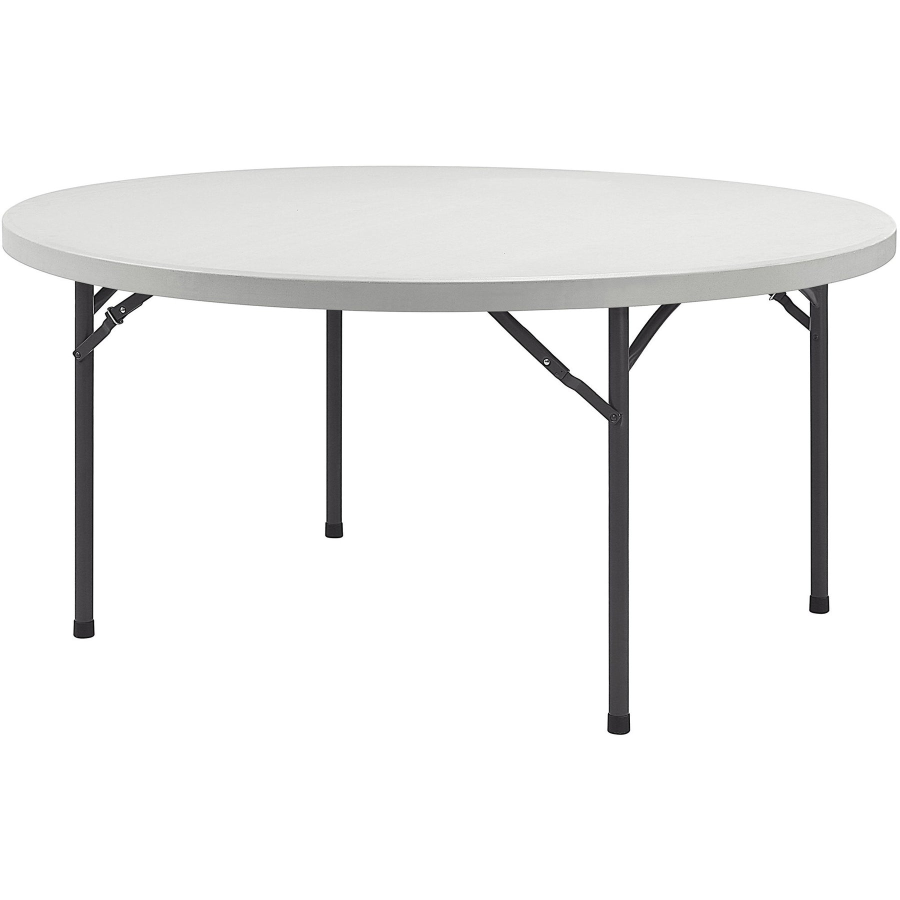 Round banquet table is designed for light-duty use indoors or outdoors. Capacity indicated refers to weight evenly distributed. The 1-1/2" thick, square-edge top is made of blow-molded, high-density polyethylene for a sturdy surface. 1" tubular steel legs are powder-coated for durability.