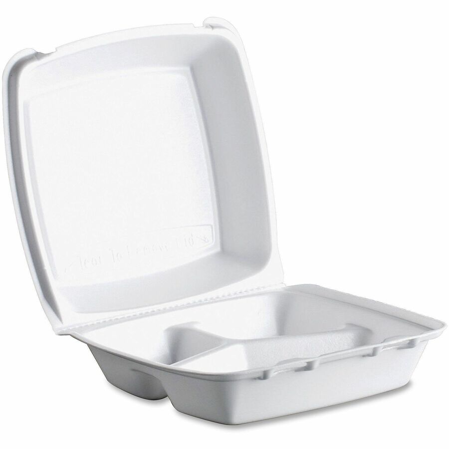 Three-compartment foam container features a secure closure to improve handling and help protect against accidental openings. High insulation qualities make it great for transporting and storing both hot and cold foods. Hinged lid is perforated to be