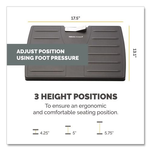 Adjust for personal comfort using foot pressure—no bending or stooping required! Locking mechanism holds footrest in position or allows you to rock back and forth to encourage lower leg movement. Three different height settings (4.13", 4.88", or 5.