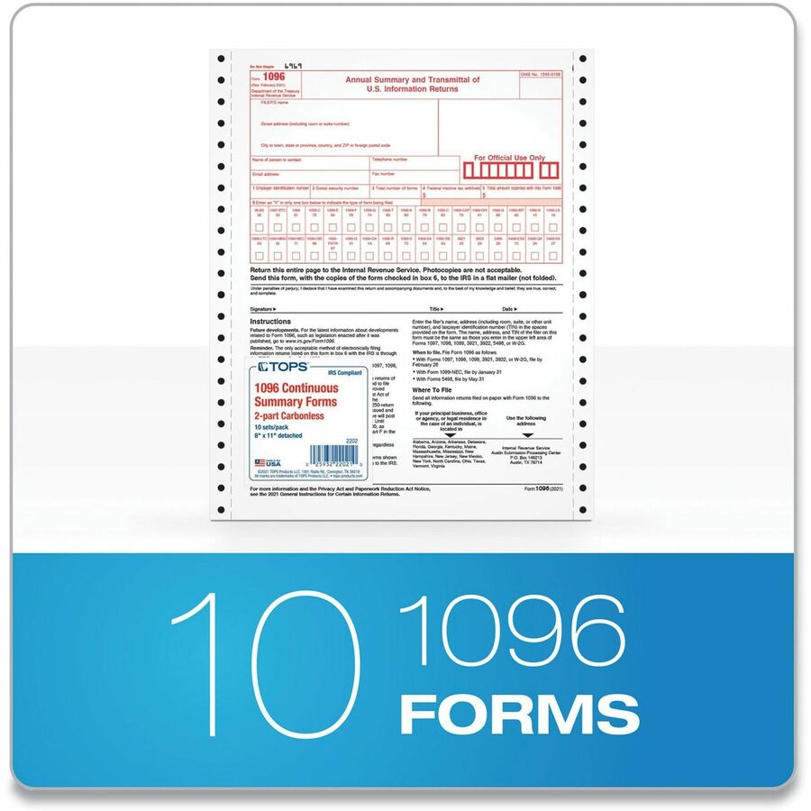 1096 forms transmit your totals for select returns to the IRS. Use 1096 forms to summarize your 1097, 1098, 1099, 3921, 3922, 5498 and W-2G forms”a separate 1096 summary is required for each type of form you file. Continuous feed two-part forms are