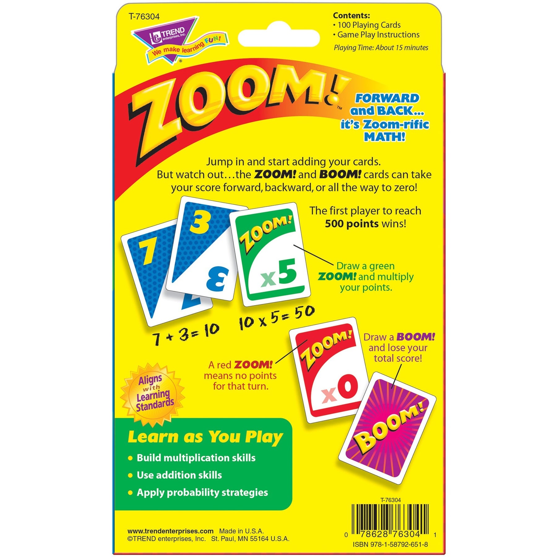 A math game with a forward/backward twist! Players add cards and watch out for wilds cards that can send their scores zooming forward, backward or nowhere at all. Builds multiplication skills. Reinforces addition skills. Applies probability strategie