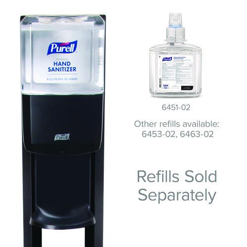Touch-free dispenser stand for PURELL® Hand Sanitizer. Freestanding design, ideal for high-traffic areas. Low profile baseplate designed to maximize stability. Lightweight and easily moved when cleaning the facility. Silver baseplate hides dirt and <