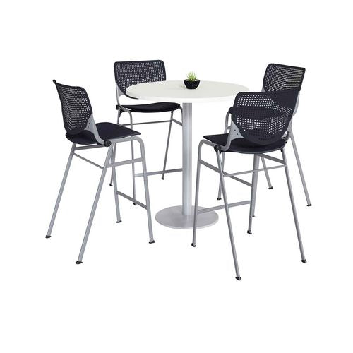 Contemporary and comfortable breakroom/cafeteria furniture. Table and 4 barstool set. This pedestal table has a 1.25" thick high-pressure laminate top that's durable and easy to clean. The top has an attractive edge that won't crack or peel. The soli- Table is 1.25" thick with a high-pressure laminate surface and T-mold edge.