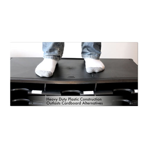 Made entirely of recycled plastic. Letter size documents or literature can be stored in one of the 12 9" x 12" x 2" compartments. Each compartment features a convenient label holder to easily identify its contents. Holds over 60 lbs. Simple assembly- Heavy duty plastic construction.