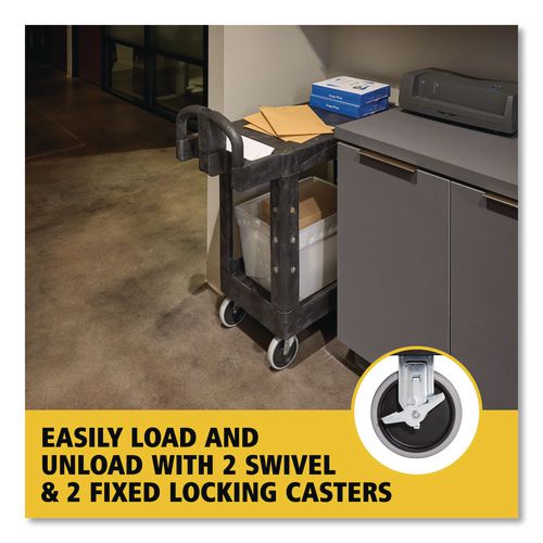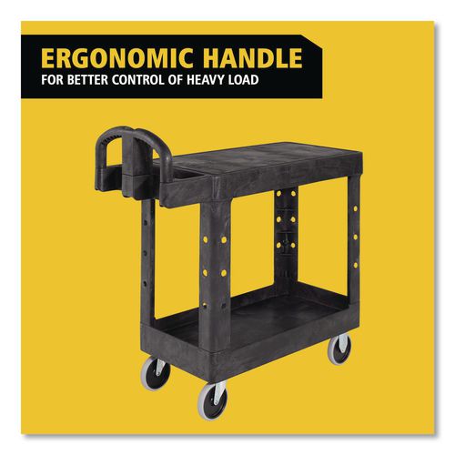 The Rubbermaid Commercial Heavy-Duty Utility Cart, 2 Shelf, Medium, is constructed of sturdy structural foam that will not dent, chip, or peel. 2 shelves support up to 500 lbs. of materials throughout the facility. Crafted with ergonomic handles for