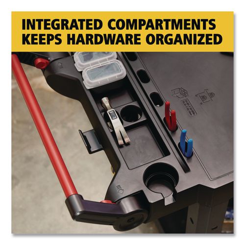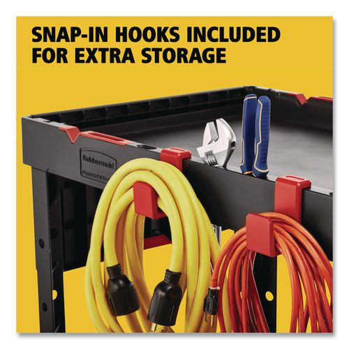 - Flip-up shelf eliminates the need to clear top shelf contents for workspace.