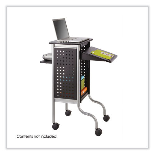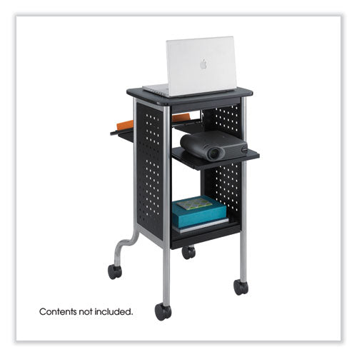 Supports laptops, computers and projectors. Handy bottom shelf for storage. Height-adjustable presentation shelf. Features four swivel casters (two locking). Color(s): Black; Color Family: Black; Caster/Glide/Wheel: (2) Twin-Wheel Locking Swivel Cast