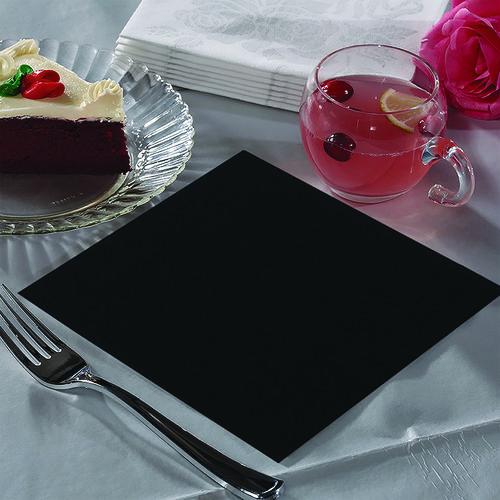 Great wet strength, absorbent and soft tissue napkins. Material(s): Tissue; Color(s): Black; Width: 9"; Depth: 9".