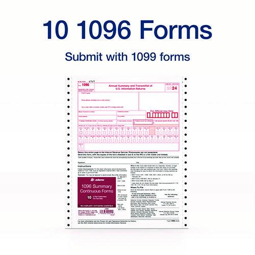 1096 forms transmit your totals for select returns to the IRS. Use 1096 forms to summarize your 1097, 1098, 1099, 3921, 3922, 5498 and W-2G forms—a separate 1096 summary is required for each type of form you file. Continuous feed two-part forms are