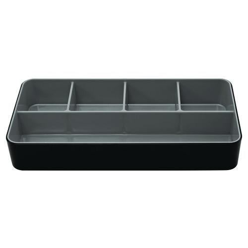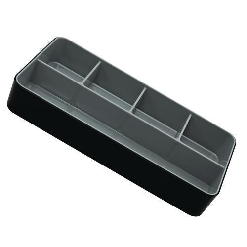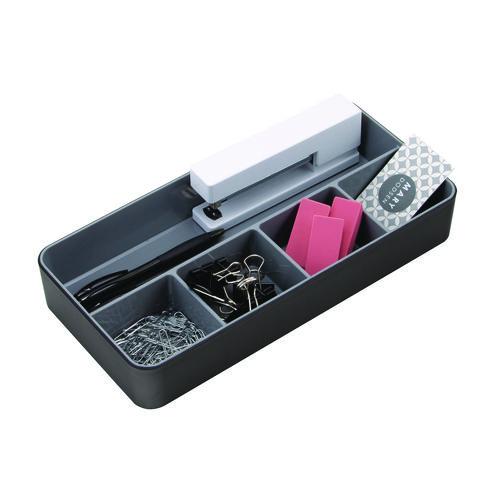 Clean, modern space-shaper that organizes small desk accessories. High-gloss, rolled edges provide bold contrast and sleek, modern design. Five separate compartments divide pens, pencils, paper clips and more. Plastic-infused durability. Desktop Supp