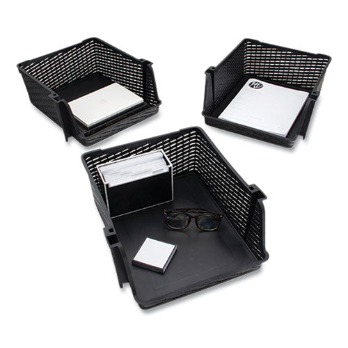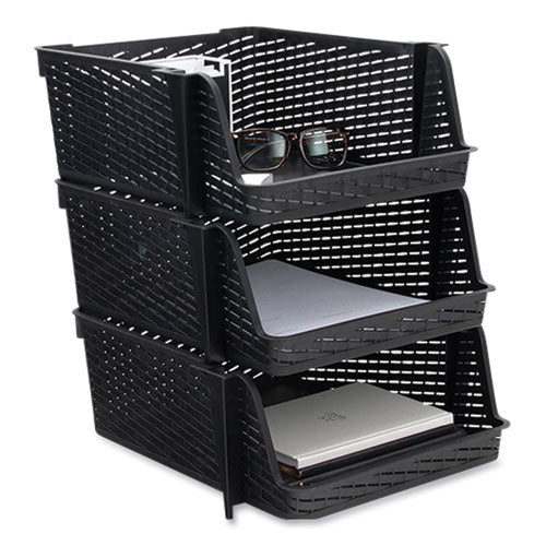 Sort, stack, and organize your clutter with this versatile three-pack of bins. Durable plastic weave bins are designed to give you a great amount of easy-to-access bin space for your ever-changing organizational needs. Perfect for a variety of storag