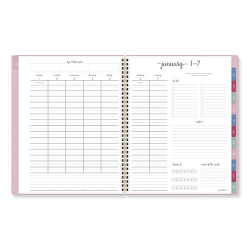 - One week per two-page spread with plenty of space for each day as well as areas for the week's goals, wins, to-dos and more