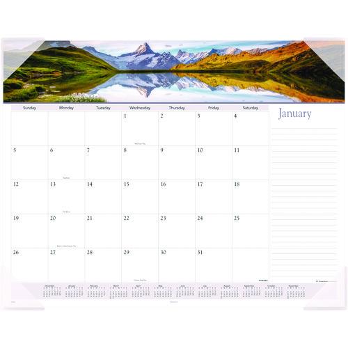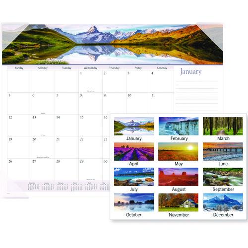 New landscape photography featured each month. Durable backboard provides a sturdy writing surface. Features full-color, wide-view photos. One month per page with unruled blocks and lined notes space. Full-year calendar reference. Four, clear poly co- New landscape photography featured each month.